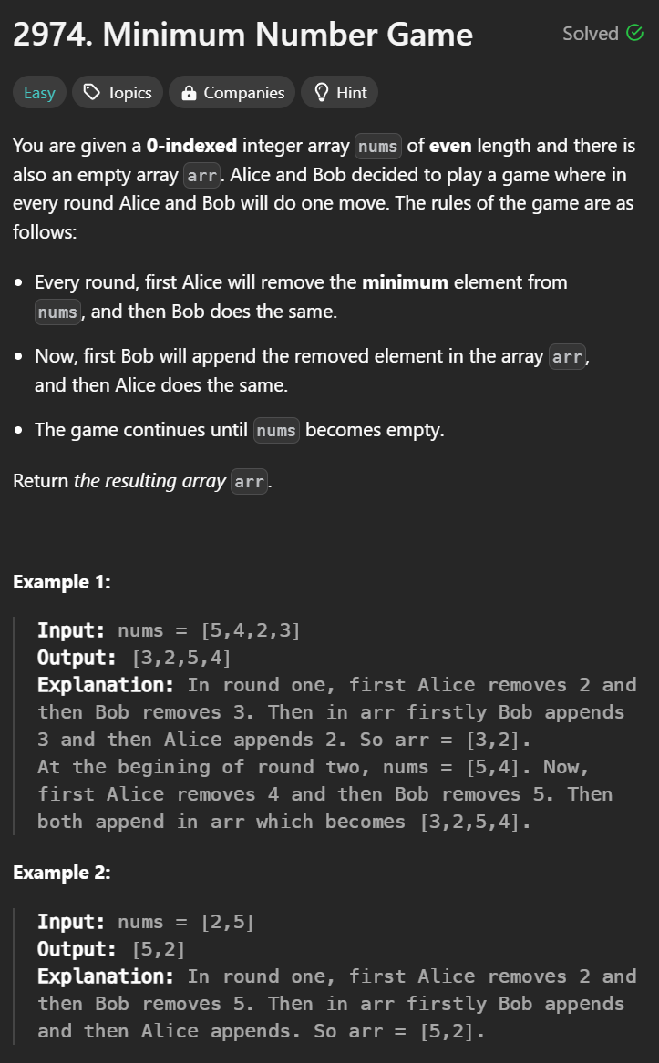 ex) nums = {5, 4, 2, 3}이고 최솟값 2를 Alice가 그 다음 작은 값인 3을 Bob이 꺼내서